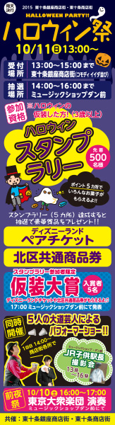 東十条商店街と東十条銀座商店街が合同でハロウィン祭りを開催します。今年は10月11日(土)、12日(日)、13日(月・祝)の3日間です。ハロウィン祭り(スタンプラリー)、長~いロールケーキカット抽選会をはじめ、模擬店・各種イベント等いろいろなアトラクションが行われます!